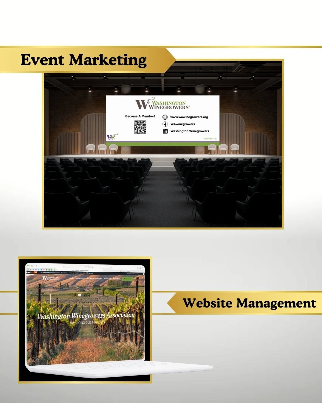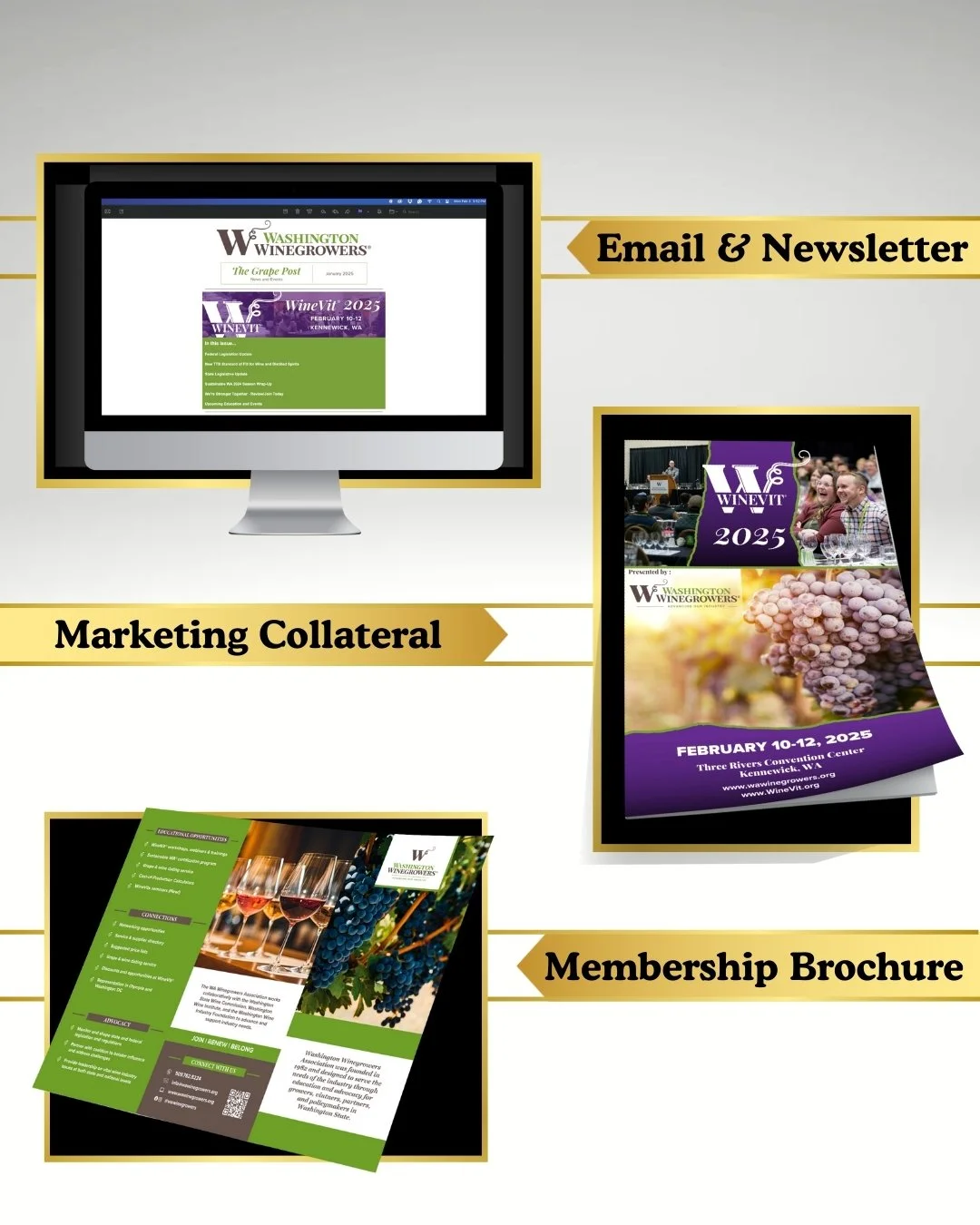 Using two different web-based platforms, we craft messages and images to reach winegrowers, vintners, and allied members, keeping the website(s) up to date with advocacy, education, and events.